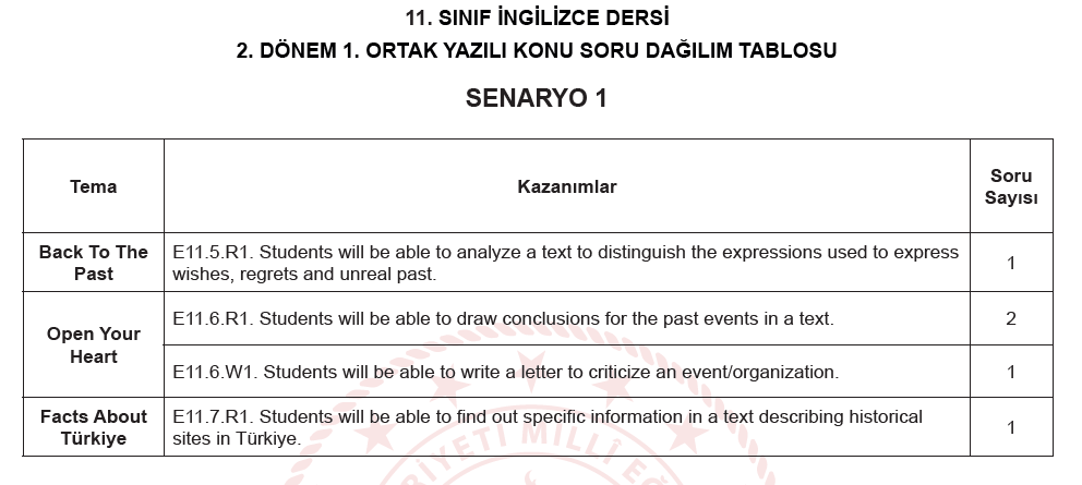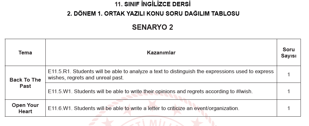 11. Sınıf İngilizce 2. dönem 1. Yazılı Senaryoları Konuları Soru Dağılım Tabloları MEB