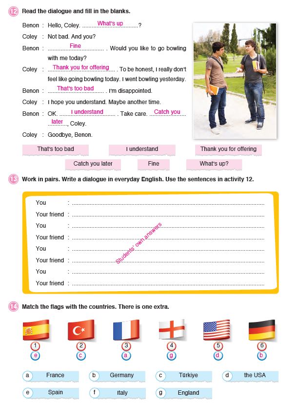 Aktivite 13 Cevapları Görselde Değil, Burada (Eşler halinde çalışın. Günlük İngilizce diyaloğu yapın. Aktivite 12’deki cümleleri kullanın)