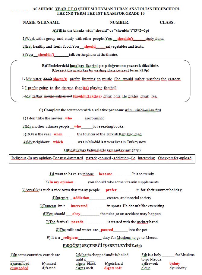 Öğrencilerimiz açık uçlu ingilizce 10. sınıf 2. dönem 1. yazılı soruları yazılılarına çalışmak için kullanabilir, cevaplarına bakarak kendilerini deneyebilirler. Öğretmenlerimiz ise örnek 10. sınıf ingilizce yazılı pdf cevap anahtarlı sorularını kendi sınıflarına göre düzenleyip, uygulayabilirler. 10.sınıf seçmeli ingilizce 2.dönem 1.yazılı test çöz indir. 10. sınıf ingilizce dinleme sınavı ve konuşma sınavı da yakında sitemizde olacak. Bizi takip edin!