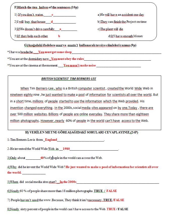 10. Sınıf İngilizce 2. Dönem 1. Yazılı Açık Uçlu Cevap Anahtarlı