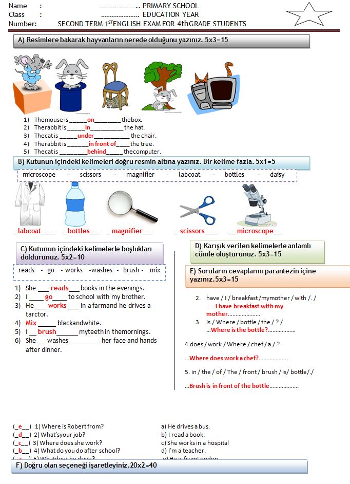 4. Sınıf İngilizce 2. Dönem 1. Yazılı Soruları