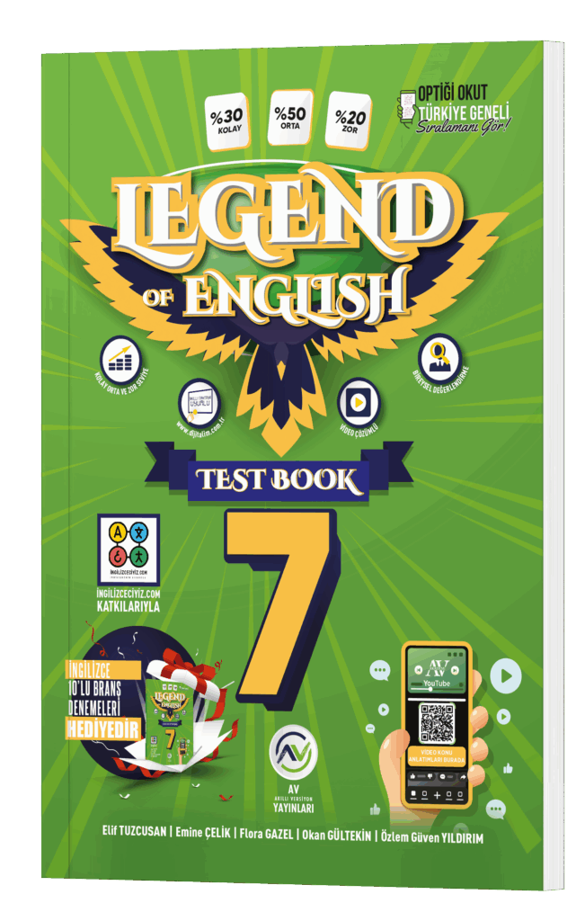7. sınıfı okutan zümrelerimiz için efsane bir kaynak kitap çıkardık.Bu kitabı yazarken güncel ders kitaplarını (SDR İpek Yolu ve MEB yayınları) sayfa sayfa inceledik analiz ettik ve “Legend of English”i sizlere sunduk. Öğrencileriniz için kitap seçmeden önce bu kitabımızı mutlaka inceleyin. İnceledikten sonra çok seveceğinize ve kullanacağınıza inanıyoruz. Bu efsane kitapta her ünite başında kelime listeleri, her üniteden 25 soruluk kelime testi, 4 adet deneme sınavı ve ünite sonlarında bir adet sarmal deneme sınavı bulunmaktadır. Ayrıca tüm serilerimiz gibi 7. Sınıf Legend English de yanında 10’lu branş denemesi hediyedir.