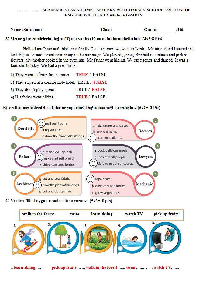 6. Sınıf İngilizce 2. Dönem 1. Yazılı Soruları