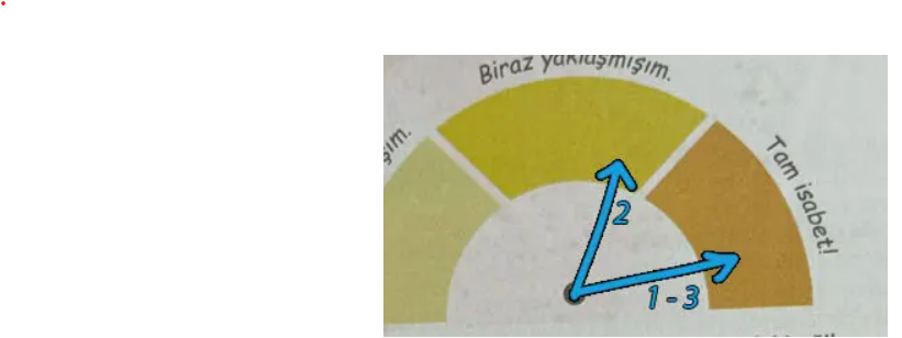 Soru: b) Metni okuduktan sonra tahminlerinizin doğruluğunu kontrol ediniz. Tahminlerinizin her biri için aşağıda verilen gösterge üzerindeki siyah noktadan uygun ifadeye doğru gösterge ibresi (oku) çiziniz. Çizdiğiniz okun üzerine ait olduğu bölümün numarasını yazınız.