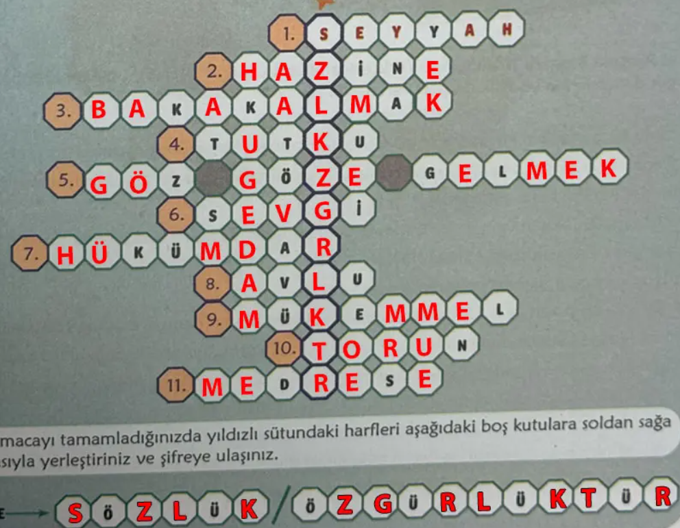Soru: Bulmacayı tamamladığınızda yıldızlı sütundaki harfleri aşağıdaki boş kutulara soldan sağa sırasıyla yerleştiriniz ve şifreye ulaşınız.