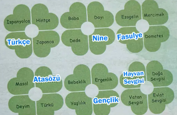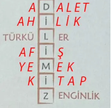 Soru: Bu anlamların hangi kelime/kelime gruplarına ait olduğunu aşağıdaki bulmacada verilen harf ipuçlarından hareketle tahmin ediniz ve örnekteki gibi sırasıyla yazınız. Tahminlerinizin doğruluğunu Türk Dil Kurumu (TDK) Güncel Türkçe Sözlük’ten, öğretmeninizden ya da aile büyüklerinizden yardım alarak kontrol ediniz.