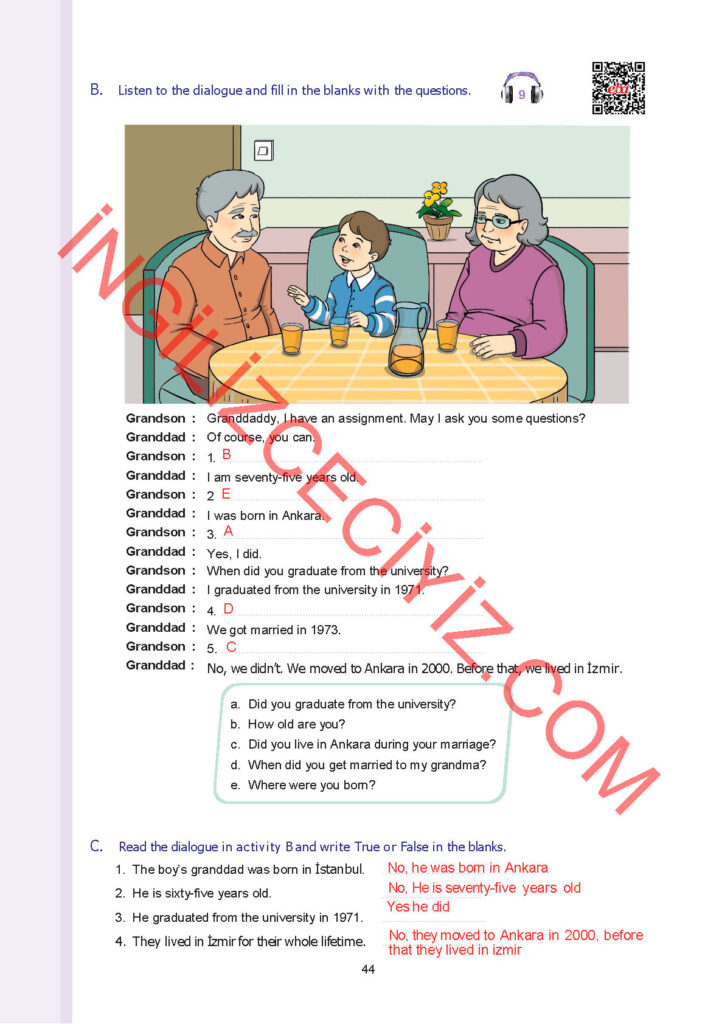 7. Sınıf İngilizce Kitabı Yıldırım Yayınları Sayfa 44 Cevapları