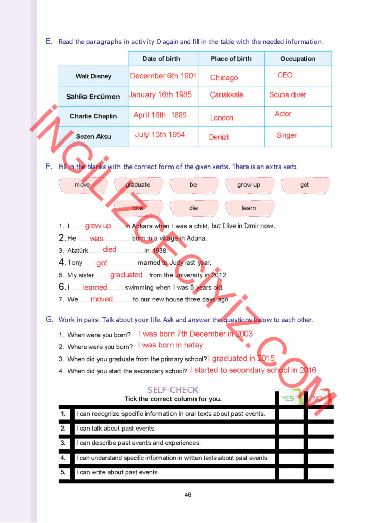 7. Sınıf İngilizce Kitabı Yıldırım Yayınları Sayfa 46 Cevapları