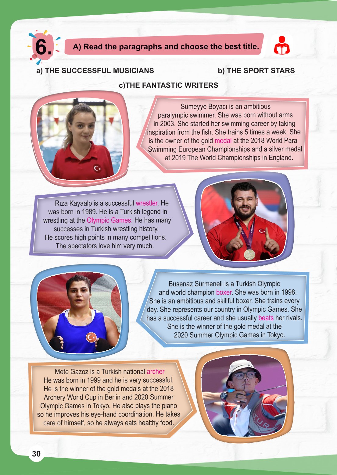 Each paragraph highlights the achievements of different Turkish athletes, including their successes in international competitions. These athletes include Sümeyye Boyacı (Paralympic swimmer), Rıza Kayaalp (Wrestler), Busenaz Sürmeneli (Boxer), and Mete Gazoz (Archer), making “The Sport Stars” the most appropriate title for the text.
