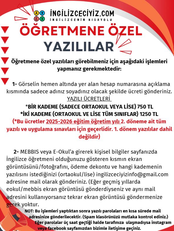 - Mebbis/E-okul ekran görüntüsü istememizdeki amacımız İngilizce öğretmeni olduğunuzu teyit etmek ve yazılı sorularına sadece İngilizce öğretmenlerinin ulaşabilmesini sağlamaktır. Bu sistem sayesinde yazılılarımıza öğrenciler veya veliler hiç bir şekilde ulaşamamaktadır. MEBBİS ekran görüntüsü gönderirken branşınız ve adınız soyadınızın göründüğünden emin olunuz. TC kimlik numaranızı veya fotoğrafınızı kapatarak gönderiniz. KVKK gereği bilgileriniz hiç bir şekilde 3. taraflarla paylaşılmayacak ve teyit edildikten sonra silinecektir. İngilizce öğretmeni olduğunu teyit etmeyen kişilere parayı yatırsalar dahi parolalar GÖNDERİLMEYECEKTİR.