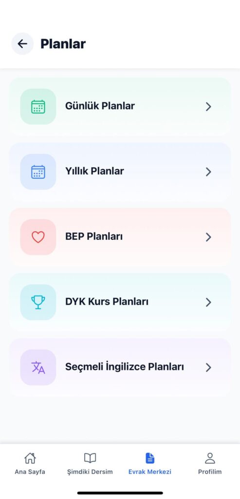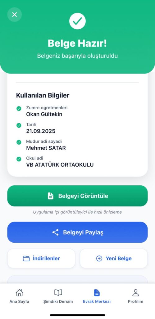 İndirdiğiniz belgeyi dilerseniz telefonunuzda görüntüleyebilir veya paylaş butonuna tıklayarak Whatsapp veya Mail ile masaüstü bilgisayarınıza aktarabilir hiç bir düzenleme yapmanıza gerek olmadan çıktınızı alabilirsiniz. Özellikle günlük planlar için çok fazla kağıt israfı olduğundan belgeyi çıkartmanıza gerek olmadan, altta yer alan “Evrak Merkezi” butonuna tıklayarak indirilen belgelerinize anında ulaşabilirsiniz. Herhangi bir teftiş durumunda bu belgeleri göstermeniz yeterli olacaktır.