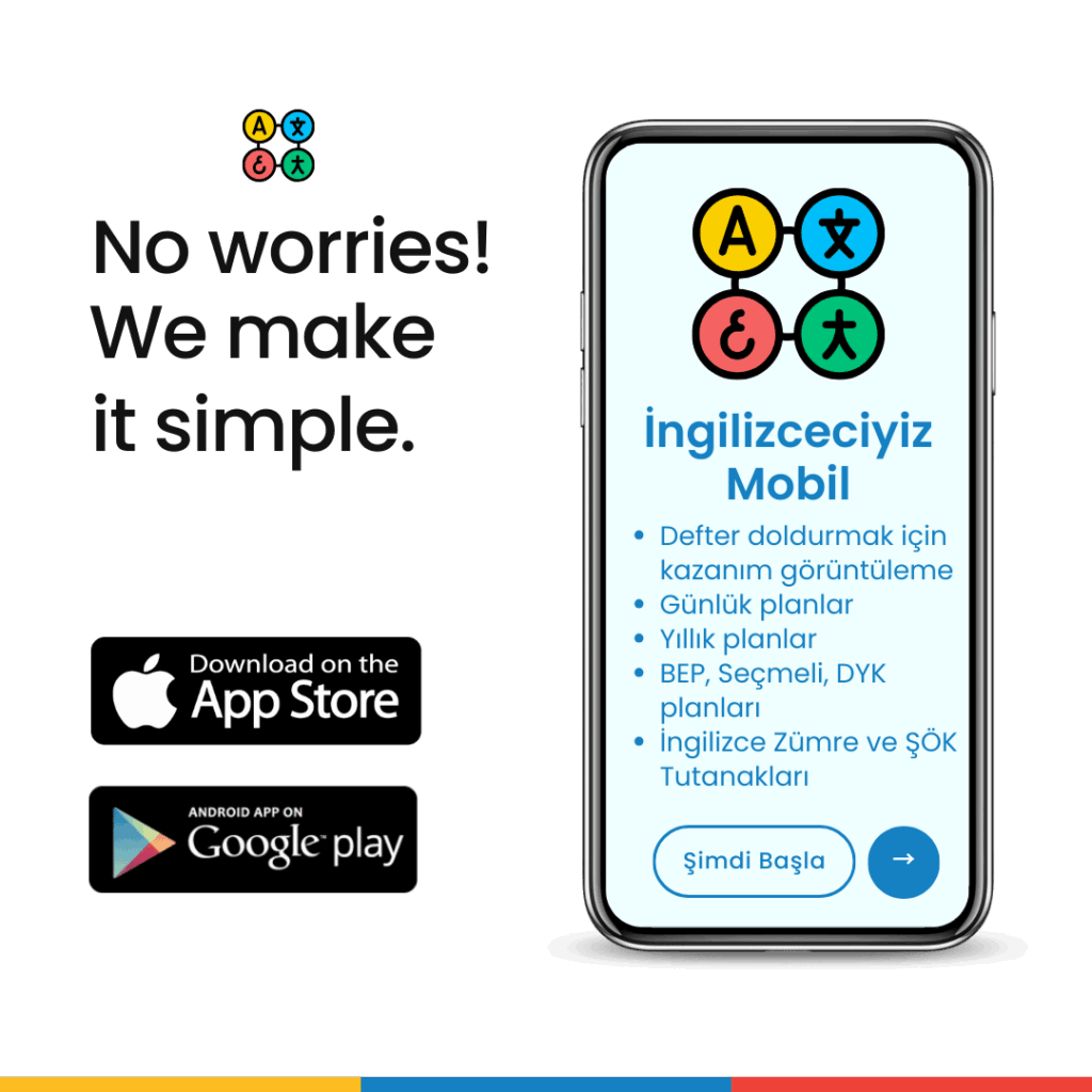ngilizceciyiz Yıllık Plan uygulaması AppStore ve PlayStore’da. Güncel yıllık planlarla uyumlu mobil uygulamamızı indirin, haftalık ders programınızı uygulamaya tanımlayın, sınıf defterini pratik şekilde doldurun! Aşağıdaki görselleri tıklayarak uygulamamızı hemen indirin.