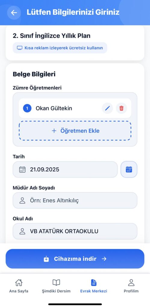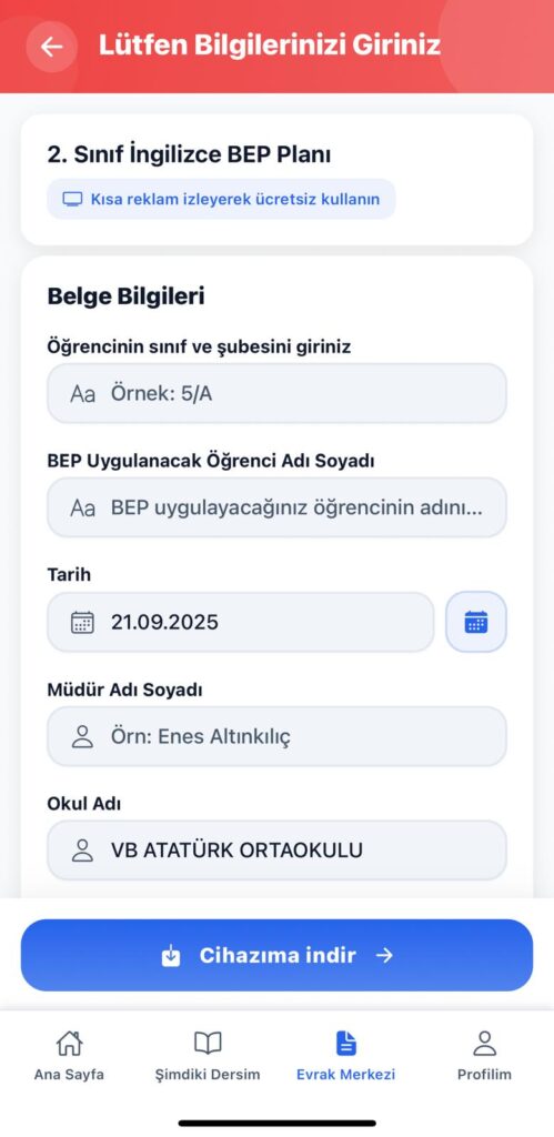 İndirmek istediğiniz plan veya tutanağa tıkladıktan sonra profilinizdeki bilgiler (Adınız Soyadınız, Okul Adınız, Müdür Adı Soyadı) belgeye otomatik olarak yerleştirilir. İndirdiğiniz belgeye göre indirme aşamasında ek bilgiler istenebilir. (Zümre öğretmenleri, BEP uygulanacak öğrenci adı vs.) bu bilgileri de girdikten sonra planı veya tutanağı cep telefonunuza bilgileriniz otomatik olarak yerleştirilmiş şekilde indirebilirsiniz.