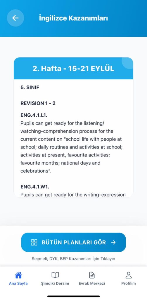 Uygulamaya girdikten sonra kazanımlarını görmek istediğiniz sınıfın üzerine tıklamanız yeterli. Bulunduğunuz haftanın kazanımını anında görüntüleyeceksiniz. İngilizceciyiz’den indirdiğiniz yıllık planlarla birebir uyumlu olduğu için sınıf defterini rahatlıkla doldurabilirsiniz.