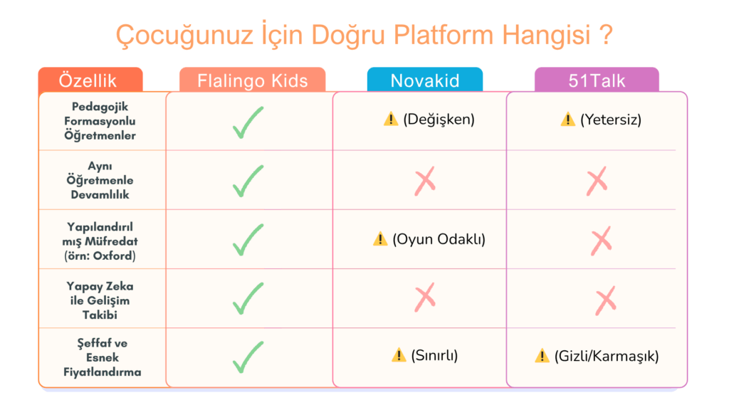 51Talk en uygun fiyatlı gibi görünse de öğretmen kalitesi ve sistemdeki belirsizlikler bu avantajı gölgede bırakabilir. Novakid’in premium paketi oldukça maliyetlidir. Sunduğu teknolojik takip (FLAI), Oxford materyalleri ve uzman öğretmen kadrosu düşünüldüğünde Flalingo Kids en dengeli ve yatırımın karşılığını veren fiyat/performans yapısını sunmaktadır.